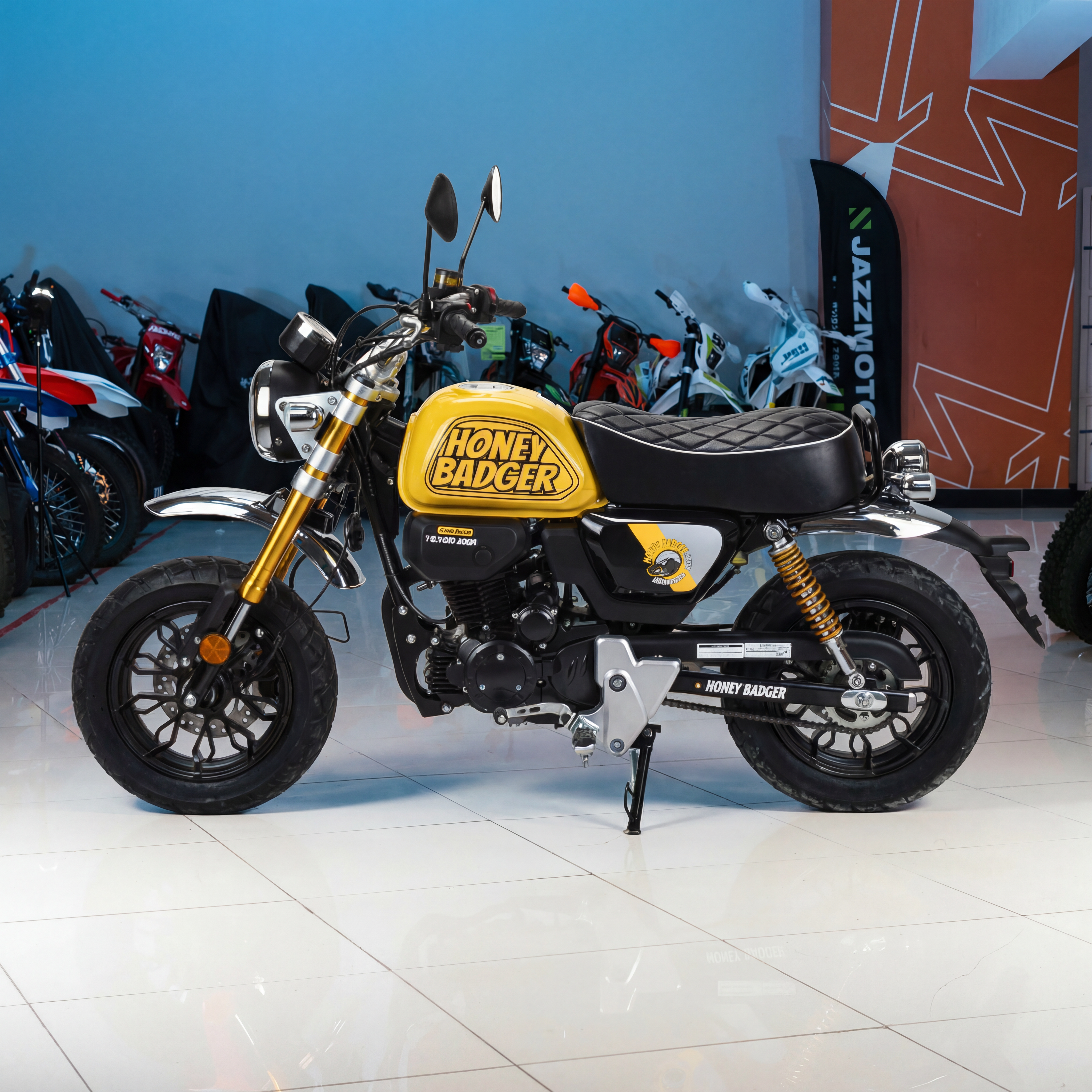 • Классический стиль Monkey — мини-руль, хромированные брызговики, выхлопная труба со штампованным теплозащитным экраном, массивные шины, мягкое сиденье и топливный бак в форме «арахиса».