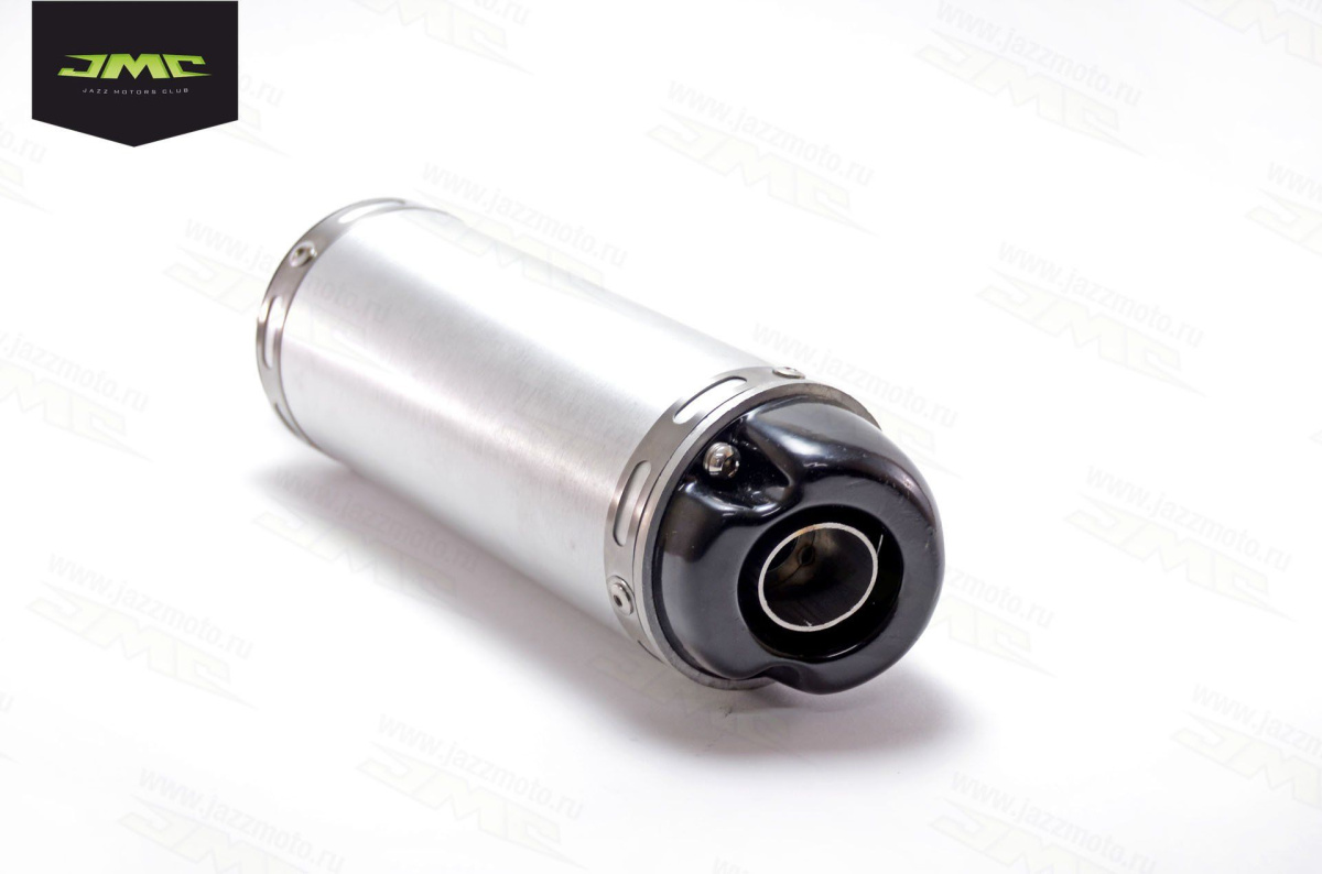 Доступный и недорогой глушитель типа JMC 125&140 MX. Входной диаметр 33мм, крепление - проушины под 2 пружины. Длина – 28 см. Диаметр алюминиевого корпуса – 8,7 см. Длина крышки глушителя – 20,6 см. Прост в установке. Подходит как для питбайков, так и для мотоциклов.